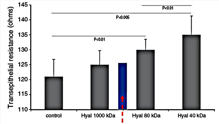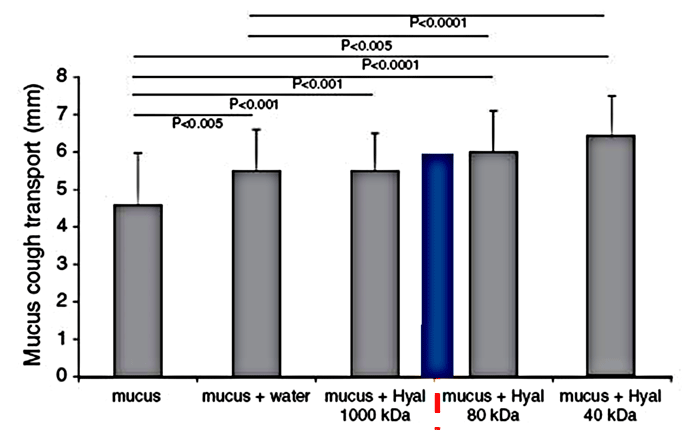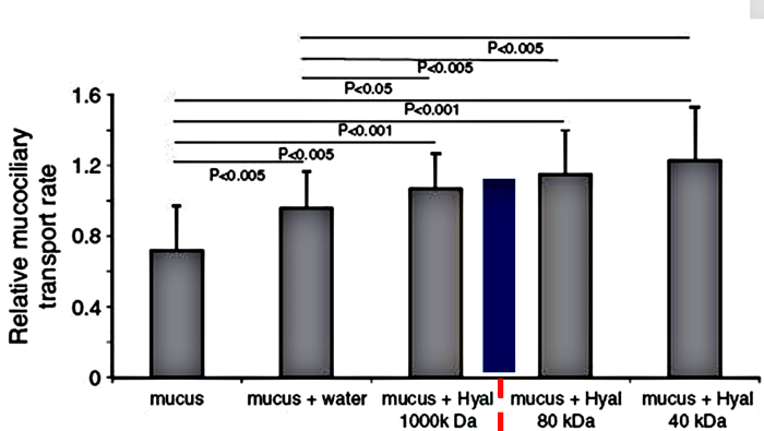 Las capacidades lubricantes y las funciones protectoras del hialuronato, un componente estructural de los tejidos intersticiales y conectivos, se evaluaron en modelos in vitro de transporte de moco en las vías respiratorias y barrera epitelial. Descubrimos que el hialuronato mejoraba el transporte del moco de las vías respiratorias por los cilios y la tos: cuanto menor era el peso molecular del hialuronato, mayor era el aumento. Por inmunofluorescencia, observamos un aumento significativo dependiente de la dosis (0.1, 1.5 y 10 mg/ml) por hialuronato de bajo peso molecular (40 kDa) en la expresión de proteínas de unión apretada como 20-1, así como un aumento de la resistencia transepitellal.