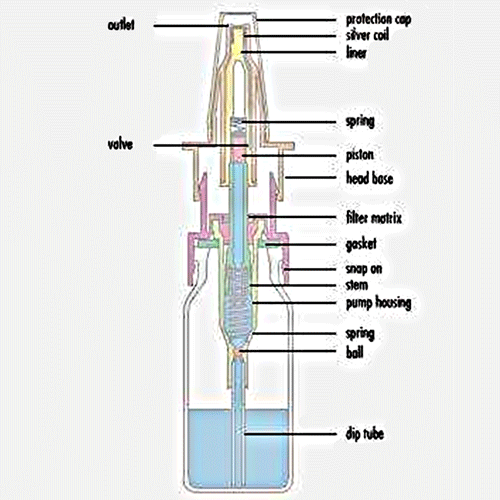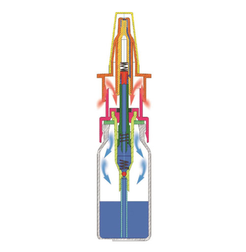 La presión baja dentro del recipiente se compensa con el ambiente, que pasa el filtro especial colocado fuera de la cámara del producto, al efectuar la presión con los dedos en la parte superior, lo que produce la nebulización.